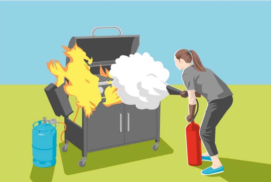 - Fettbrand: Drehen Sie im Brandfall wenn möglich (mit feuerfesten Grillhandschuhen!) das Gas ab und setzen Sie eine Löschdecke bzw. einen Feuerlöscher der Klassen B oder F ein. Versuchen Sie auf keinen Fall, einen Fettbrand mit Wasser zu löschen! Der explodierende Dampf (ein Gasgrill wird bis zu 800 Grad heiss) verursacht durch das Mitreissen tausender brennender Fetttröpfchen verheerende Schäden.