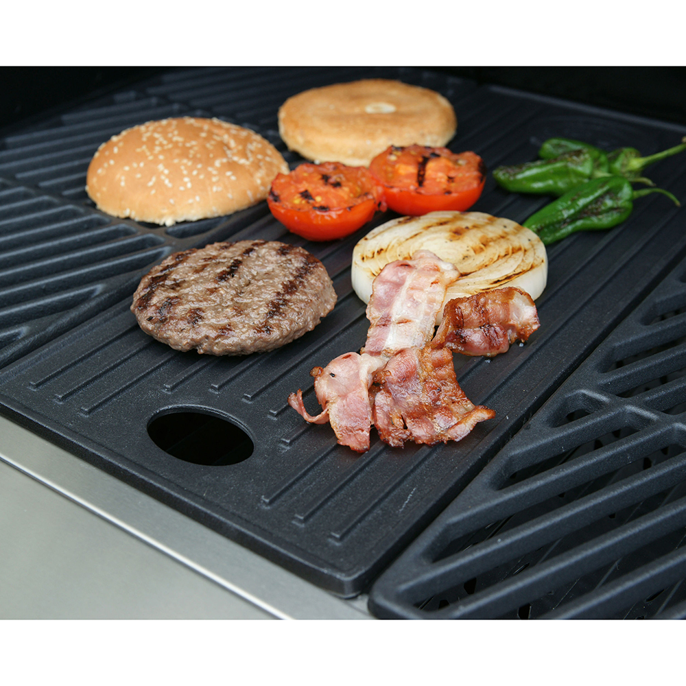 Die Dualchef Grillplatte aus Gusseisen speichert die Hitze optimal und gleichmässig. Die wendbare Grillplatte verfügt über eine gerippte und glatte seite und bietet so unzählige Zubereitungsmöglichkeiten. Die glatte Seite eignet sich perfekt für Pancakes, Crépes oder Eierspeisen, die gerippte Seite für Kurzgebratenes.