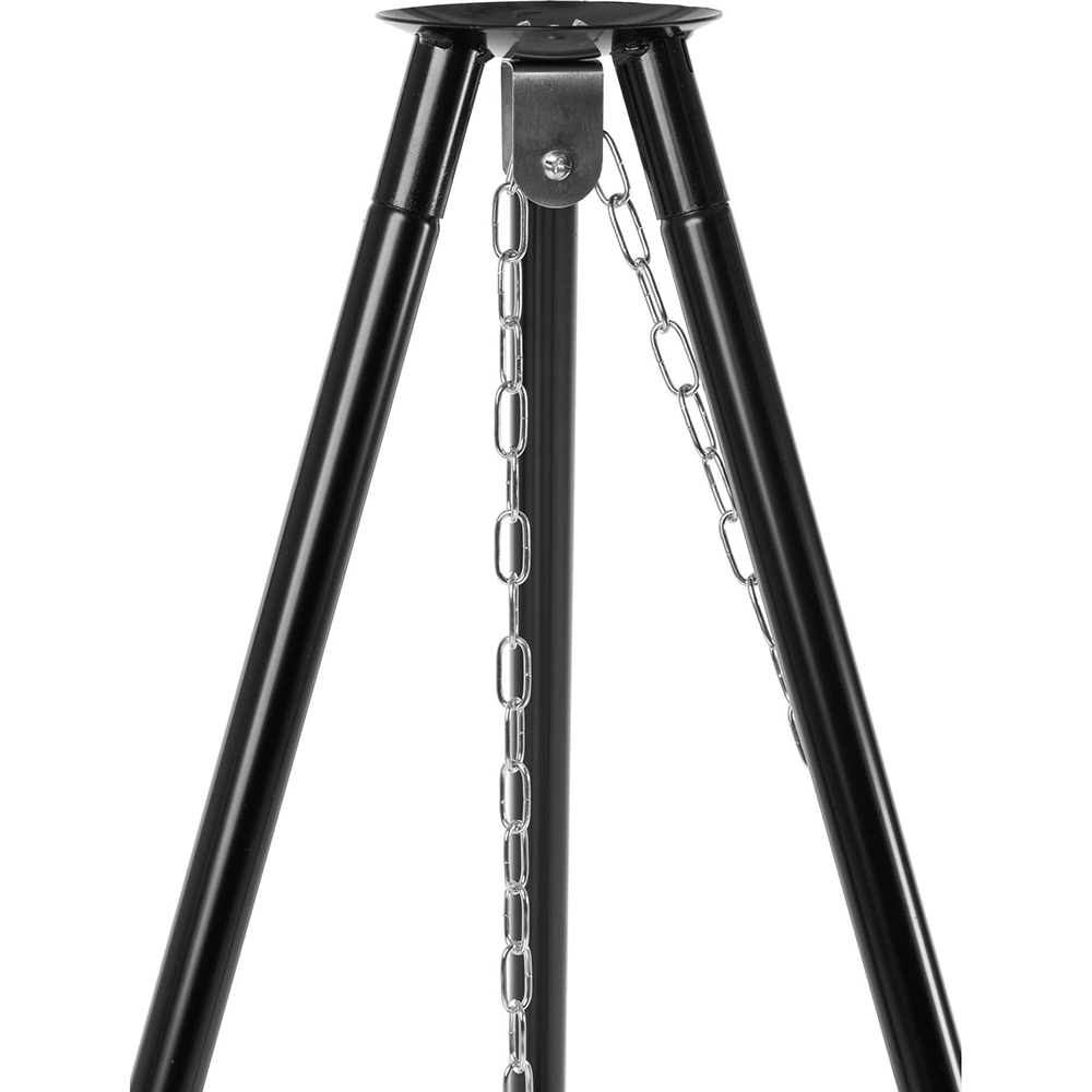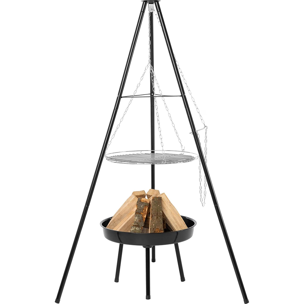 Hängender Grillrost aus Stahl für Holz- oder Holzkohlefeuerung. Die robuste Konstruktion ist einfach aufzubauen und abzubauen. Die Höhe des Grillrosts ist stufenlos mit einer Kettenwinde verstellbar.