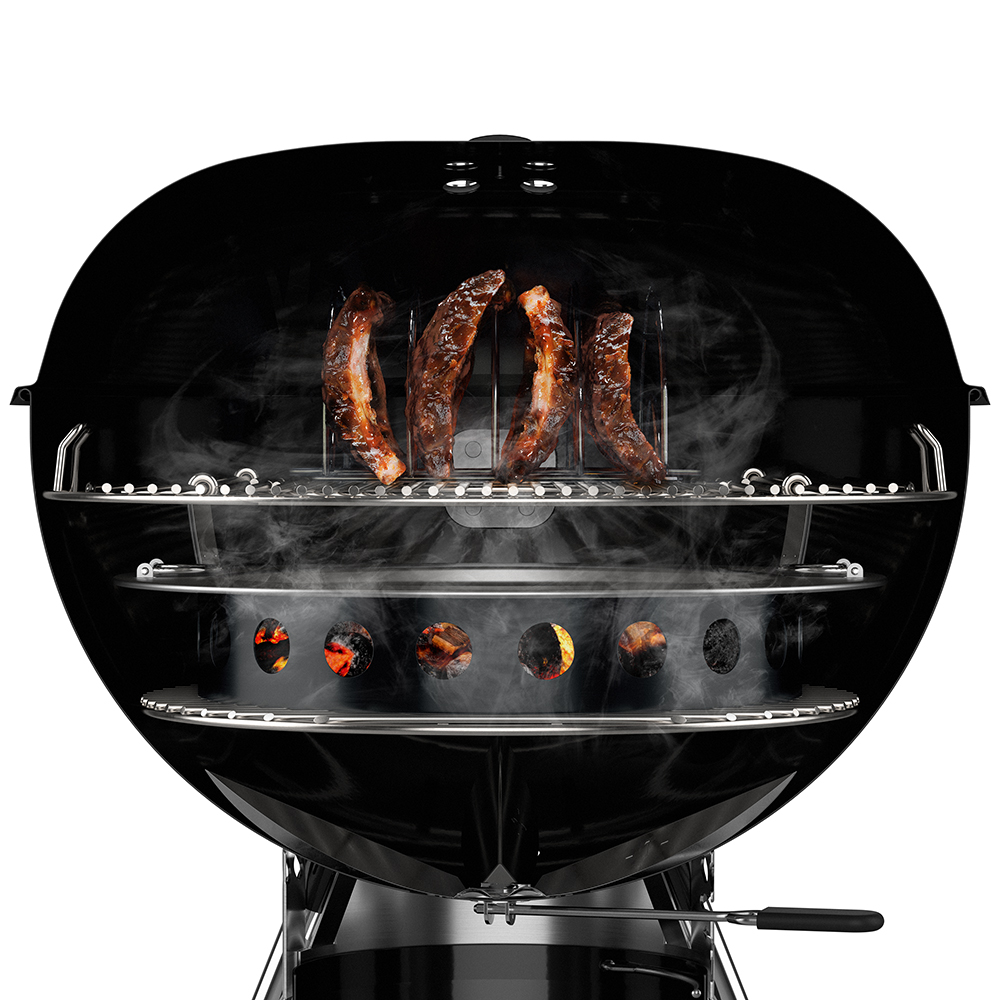 Zubehörkit wird die Hitze vom Grillgut weg geleitet, um gleichmässig niedrige Temperaturen bei langen Gar- und Räucherzeiten zu