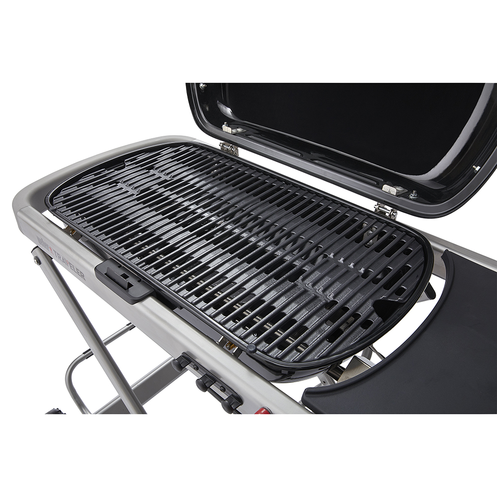 Weber bringt mit dem brandneuen Traveler den ultimativen Transportgrill schlechthin! Der Traveler ist der ideale Begleiter für unterwegs, ob fürs Picknick, Campingausflüge, am Strand oder auf dem Balkon oder Terrasse. Mit dem mobilen Gasgrill kannst du jederzeit und überall Grillieren. Die grosszügige Grillfläche von 64 x 34 cm bietet Kapazität für bis zu neun Personen, so kriegst du problemlos deine Freunde und Familie satt. Mit den porzellanemaillierten Gusseisenrosten gibt es eine optimale Hitzeverteilung, dadurch ist 100% Grillgeschmack jedes Mal garantiert. Der Traveler schafft eine lange Grillzeit bei geringem Gasverbrauch. Zudem kommt der grosse Seitentisch mit 1200 cm² Ablagefläche, da kann das fertig gegarte Grillgut abgelegt werden, die drei praktischen Besteckhalter helfen dir Ordnung bei den Grillwerkzeugen zu halten. Auch die Reinigung des Travelers ist sehr simple, der Grill besitzt eine herausnehmbare Fettauffangschale, so kann man problemlos das herabtropfende Fett entsorgen.