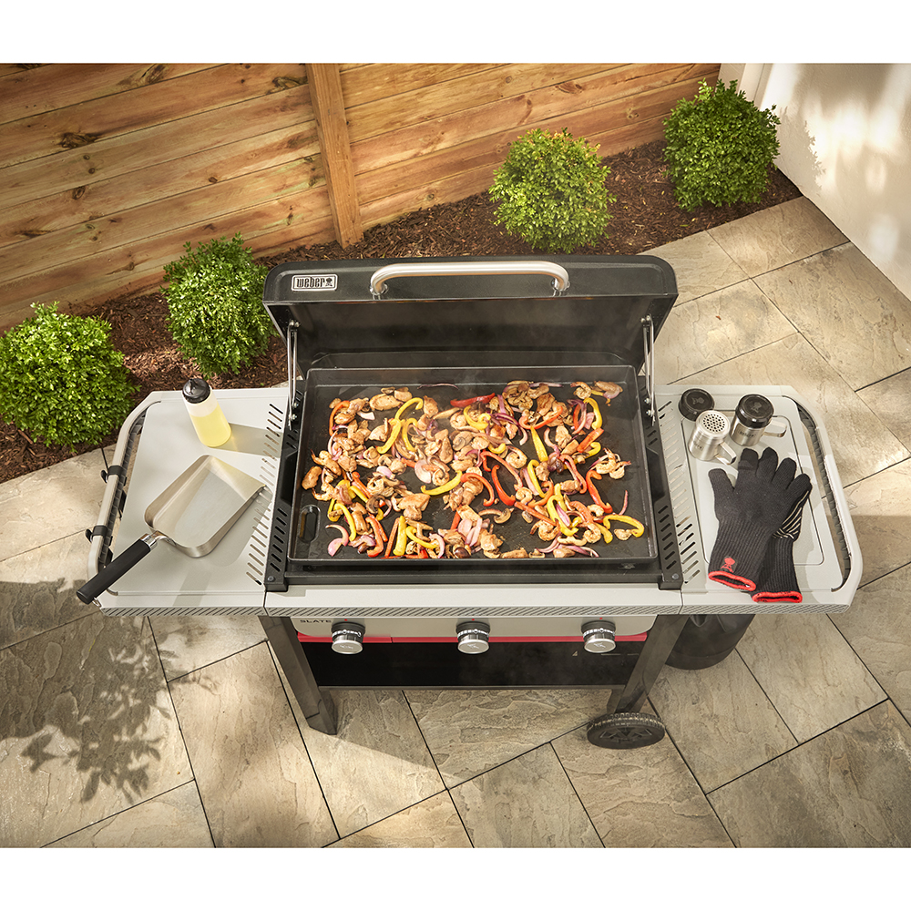 der Weber SLATE GPD 71 cm Premium Plancha setzt Weber neue Massstäbe. Die Plancha erreicht mit drei Brennern über 260°C und verfügt über eine grosszügige Grillfläche. Der Grill steht auf einem praktischen, rollbaren Unterbau mit Platz für Reinigungs- und Grillzubehör und zwei Seitenablagen. Die porzellanemaillierte Antihaft-Grillfläche ist schnell einsatzbereit, so dass saftige Burger, Pfannengerichte,