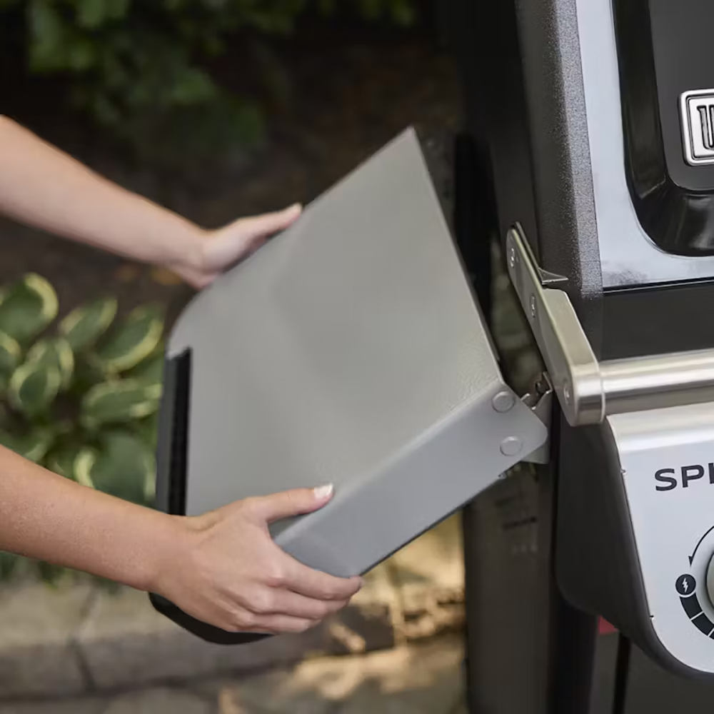 - Weber Works Schienen an den Seitentischen für die Erweiterung mit Snap-On-Zubehör (Separat erhältlich) wie Flaschenhalter, zusätzliche Besteckhalter oder flexible Leuchten